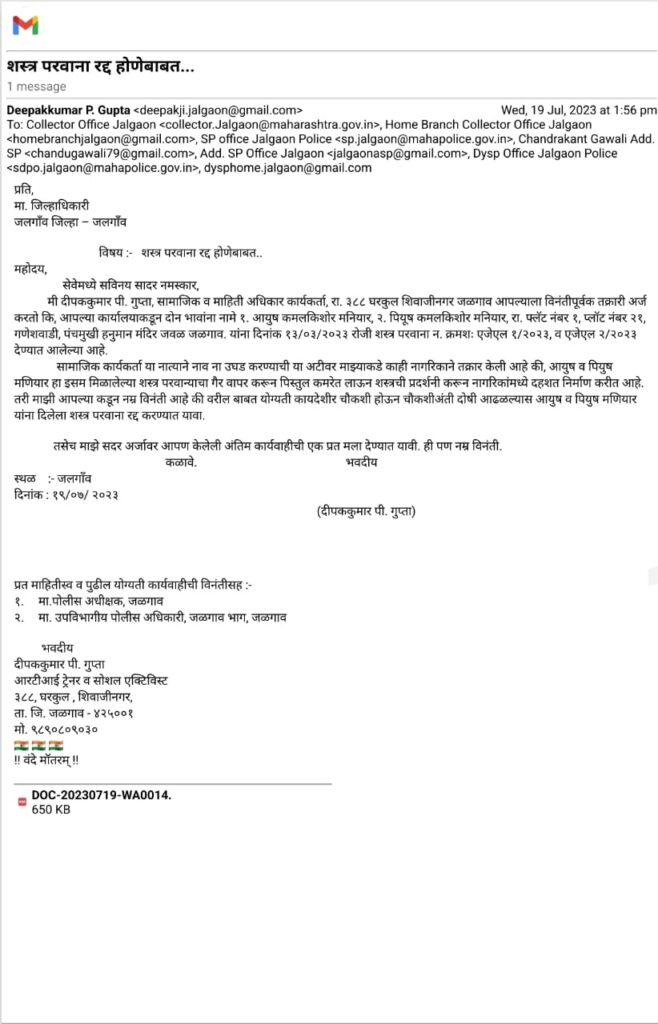 जळगाव (क्राईम दुनिया न्यूज नेटवर्क): जळगावच्या आयुष कमलकिशोर मणियार आणि पियुष कमलकिशोर मनियार या दोघा बंधूंना शासनाने अगोदर नाकारलेला शस्त्र परवाना नंतर अधिकारी बदलताच देण्यात आला. या मणियार बंधूंना शस्त्र परवान्याची गरज काय? या मणियार बंधूंचे जनसेवेशी निगडीत कोणते उद्योग आहेत? ज्यावेळी सुरुवातीला त्यांचा शस्त्र परवाना नाकारण्यात आला होता त्यानंतर त्यांच्यावर असा कोणता जीवघेणा हल्ला झाला होता? की ज्यामुळे अधिकारी बदलताच त्यांना शस्त्र परवाना देण्यात आला? असे अनेक प्रश्न सध्या चर्चेत आले आहेत. कमरेला पिस्टल खोचून हे बंधू समाजात दहशत पसरवतात असे म्हटले जाते. सामाजिक तथा माहिती अधिकार कार्यकर्ता दीपककुमार गुप्ता यांनी या मणियार बंधूंचा शस्त्र परवाना रद्द करण्याची मागणी सन 2023 मधे शासन दरबारी केली होती.