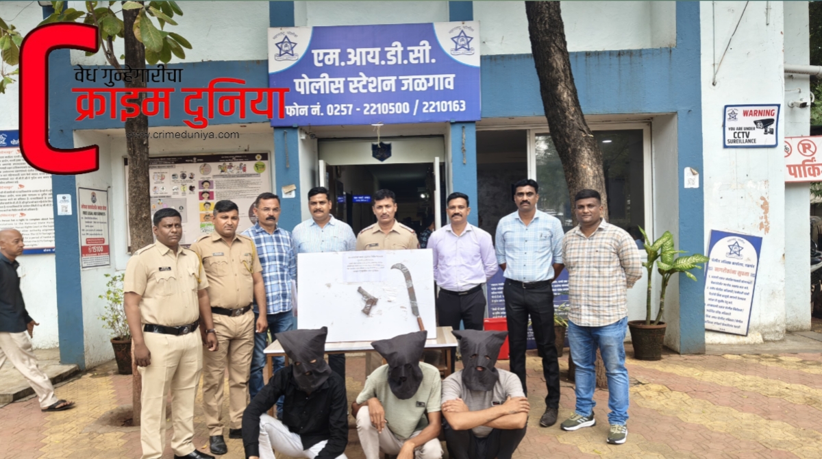 जळगाव : हद्दपार आरोपीसह त्याच्या दोघा साथीदारांना गावठी कट्टा, जीवंत काडतुस व धारदार कोयता अशा घातक हत्यारांसह अटक करण्यात आली आहे. एमआयडीसी पोलिस स्टेशनचे पोलिस निरीक्षक बबन आव्हाड यांच्या गुन्हे शोध पथकाने ही कारवाई केली आहे. तेजस दिलीप सोनवणे, खुशाल पितांबर सोनार आणि चेतन पितांबर सोनार अशी अटक करण्यात आलेल्या तिघांची नावे आहेत. यापैकी तेजस दिलीप सोनवणे यास जळगाव जिल्ह्यातून दोन वर्षासाठी हद्दपार करण्यात आले आहे. तरीदेखील तो हद्दपारीच्या आदेशाचे उल्लंघन करुन जळगाव शहरातील नेहरु नगर परिसरात फिरतांना आढळून आला.