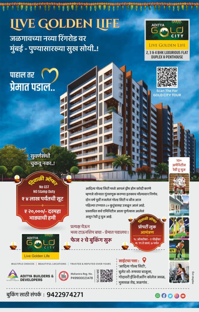 जळगावच्या नव्या रिंगरोडवर आलंय मुंबई-पुण्यासारख्या सुखसुविधा असलेलं तुमच्या हक्काचं घर! आदित्य गोल्ड सिटी एकदा पाहाल तर सरळ प्रेमात पडाल!