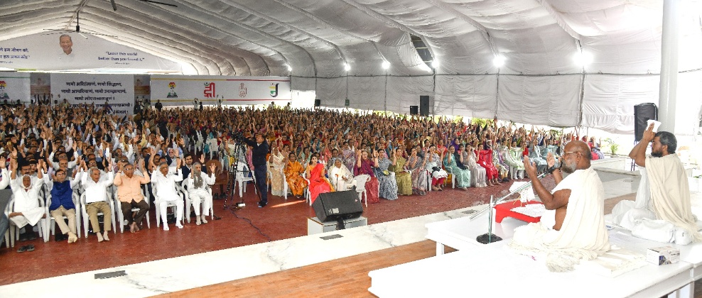 आकाश ग्राऊंडवर भवरलालजी आणि कांताबाई जैन परिवारातर्फे झालेल्या प्रभावी प्रवचनाची सुरवात प. पू. डॉ. शांतीप्रिय सागरजी म.सा. यांनी ‘जीवन में कुछ करना है, तो हिम्मत ना हारे..’ या प्रेरणागिताने केली. पृथ्वीवरील स्वर्ग हा जैन हिल्स वर अवतरला असून लंडन, अमेरिकेपेक्षाही सुंदर ठिकाण म्हणजे जैन हिल्स आहे. याठिकाणी प्रकृतीच्या पृथ्वी, आकाश, हवा, अग्नी, पाणी यांच्या संगमातून पुढे चालत राहण्याचा संस्कार मिळतो, ‘सडक से शिखर’ पर्यंत प्रवास करायचा असेल तर ‘कर्म हेच जीवन’ हे मानून परिश्रम करत राहिले पाहिजे असे मोलाचे विचार त्यांनी व्यक्त केले.