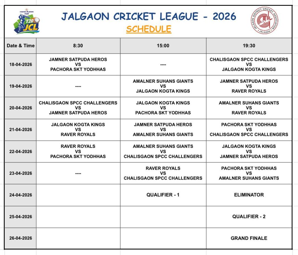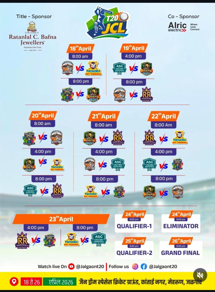 जळगाव जिल्हा क्रिकेट असोसिएशनच्या वतीने व रतनलाल सी. बाफना ज्वेलर्स प्रायोजीत व अलरीक इलेक्ट्रीकल्स सहप्रायोजकत्वाखाली आयोजित जळगाव क्रिकेट लिग-२०२६, JCL T-20 क्रिकेटचा महा-थरार सहा संघांमध्ये रंगेल. लीग मॅचेच मध्ये प्रत्येक टीम पाच सामने एकमेकांशी खेळेल. त्यानंतर क्लालिफायर व एलिमेंटर सामने झाल्यानंतर ग्रॅण्ड फायनल होईल. एकूण १९ सामन्यांमधून चौकार, षटकारांसह गुगली, यॉर्कर, बॉउन्सरची धमाल बघायला मिळणार आहे. कांताई नगर जैन ड्रीम स्पेसेस येथील क्रीडांगणावरील ट्रप्फ विकेट सज्ज झाली आहे. हिरवळीच्या सुसज्ज लॉनसह मैदानाच्या बाऊंडरी ह्या एलईटी स्क्रीन ने लावण्यात आल्या आहेत. दिवस रात्रीच्या सामन्यांसाठी विशेष एलईडी लाईटांची व्यवस्था करण्यात आली आहे. मुंबई पुणे सारख्या मेट्रो सिटीमधील स्टेडियमचा लुक जैन ड्रीम स्पेसेस च्या क्रीडांगणावर अनुभवता येईल, यासाठी प्रेक्षकांसाठी विशेष गॅलरीची व्यवस्था करण्यात आली आहे. ती सर्वांसाठी खुली असेल.