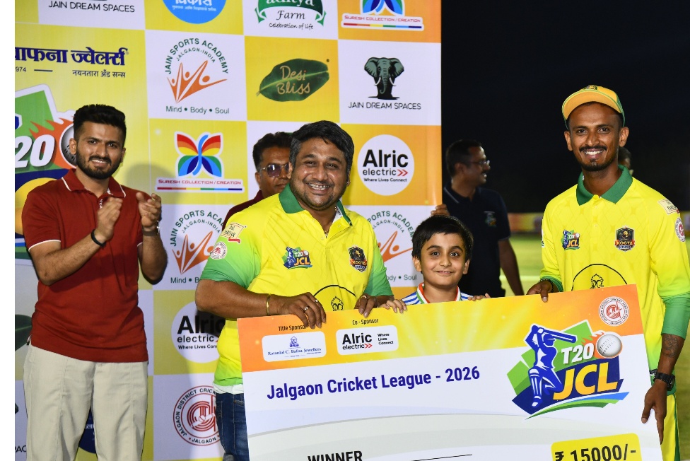 पहिल्याच रोमांचकारी सामन्यात जामनेर सातुपडा हिरोज यांनी ‘अक्षय’ विजय – जळगाव जिल्हा क्रिकेट असोसिएशनच्या वतीने व रतनलाल सी. बाफना ज्वेलर्स प्रायोजीत व अलरीक इलेक्ट्रीकल्स सहप्रायोजकत्वाखाली आयोजित जळगाव क्रिकेट लिग-२०२६, JCL T-20 क्रिकेटचा रोमहर्षक संग्रामाला सुरवात झाली. जामनेर सातुपडा हिरोज् व पाचोरा एसकेटी योद्धाज मध्ये झालेल्या पहिल्याच रोमांचकारी सामन्यात जामनेर सातुपडा हिरोज यांनी ‘अक्षय’ विजय नोंदविला. मेहरूण तलाव परिसरातील कांताई नगर येथील जैन ड्रीम स्पेसेस येथील भव्य क्रीडांगणावर सुरू असलेल्या जळगाव क्रिकेट लीगच्या पहिल्या सामन्याचे नाणेफेक जळगाव जिल्हा क्रिकेट असोसिएशनचे अध्यक्ष अतुल जैन यांच्या हस्ते झाले. जामनेर सातपुडा हिरोज् संघाचे कर्णधार शतायू कुलकर्णी यांनी नाणेफेक जिंकून प्रथम गोलंदाजी करण्याचा निर्णय घेतला. गोलदांजांची निर्णय सार्थ ठरवत रामकृष्णा राठोड यांनी 14 निर्धाव चेंडू टाकत 3 विकेट घेतल्यात. त्याला शतायू कुलकर्णी 3 विकेट ने चांगली साथ दिली.
