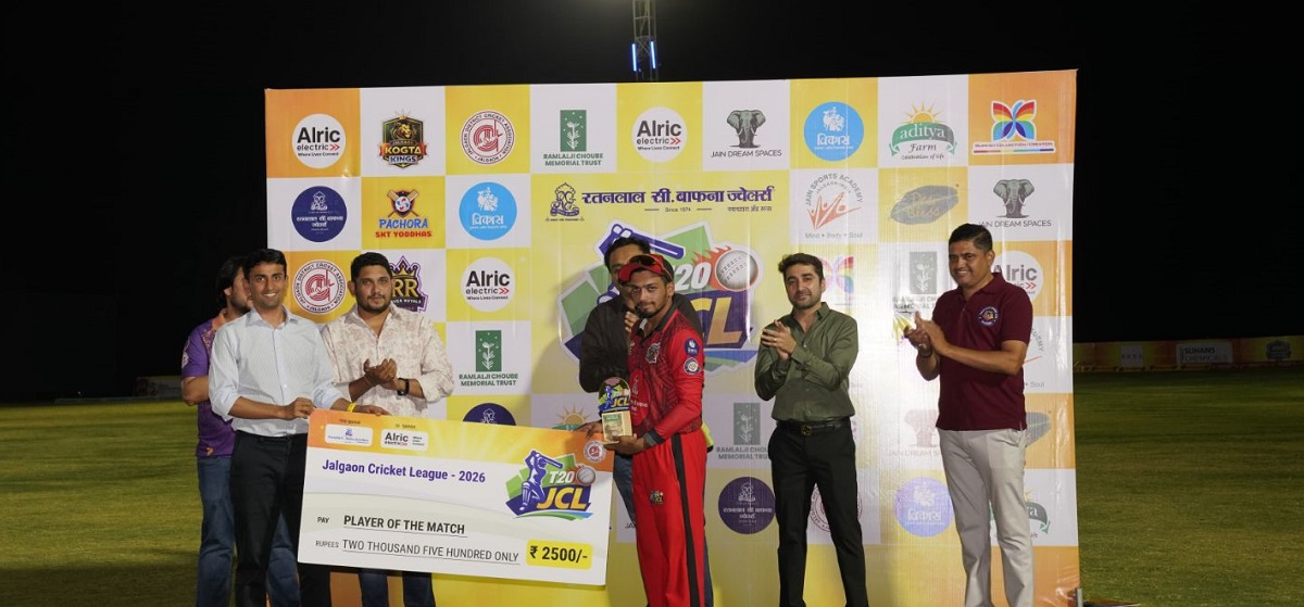 जळगाव, दि.23 (प्रतिनिधी) – जळगाव जिल्हा क्रिकेट असोसिएशनच्या वतीने व रतनलाल सी. बाफना ज्वेलर्स प्रायोजीत व अलरीक इलेक्ट्रीकल्स सहप्रायोजकत्वाखाली आयोजित जळगाव क्रिकेट लिग-२०२६, JCL T-20 क्रिकेट स्पर्धेत आज सहाव्या दिवशी अत्यंत चुरशीच्या झालेल्या सामन्यात चाळीसगाव एसपीसीसी चॅलेंजर्स संघाने विजय मिळविला तर रावेर रॉयल्सचे सर्व गडी बाद होऊन १७५ धाव करू शकला मात्र सामन्यातून बाद झाला. सामन्यानंतर झालेल्या पारितोषिक वितरणात ओम मुंडे याला मॅन ऑफ दी मॅचने गौरविले गेले. यावेळी अमित आहुजा, ज्ञानेश्वर पाटील, अभंग जैन, कुणाल शहा, विमल जैन, प्रतिक जोशी आदी मान्यवर उपस्थित होते.