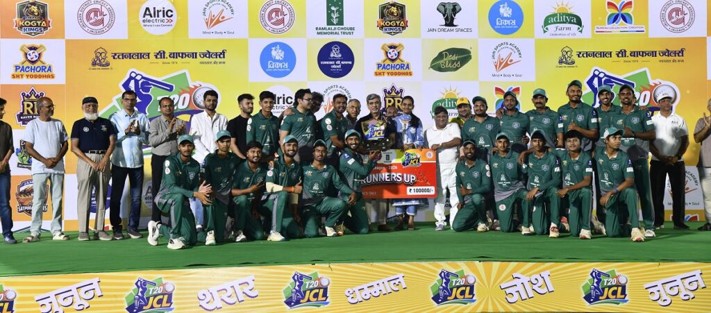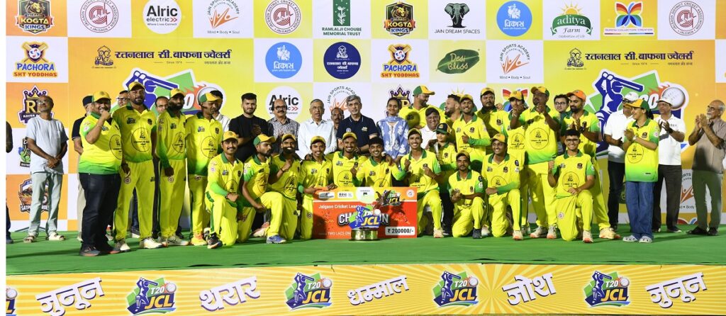 जळगाव दि.२६ प्रतिनिधी – रोमांचक आणि थरारक सामन्यांनी जैन ड्रीम स्पेसेस वर रंगलेल्या जळगाव क्रिकेट लिगचा अंतिम सामना अमळनेर सुहांस जायंट्स व जळगाव कोगटा किंग्ज मध्ये झाला. पुर्वेस चौधरीच्या मॅचविनिंग खेळीने जळगाव कोगटा किंग्ज यंदाच्या जेसीएलच्या चषकावर आपले नाव कोरले.